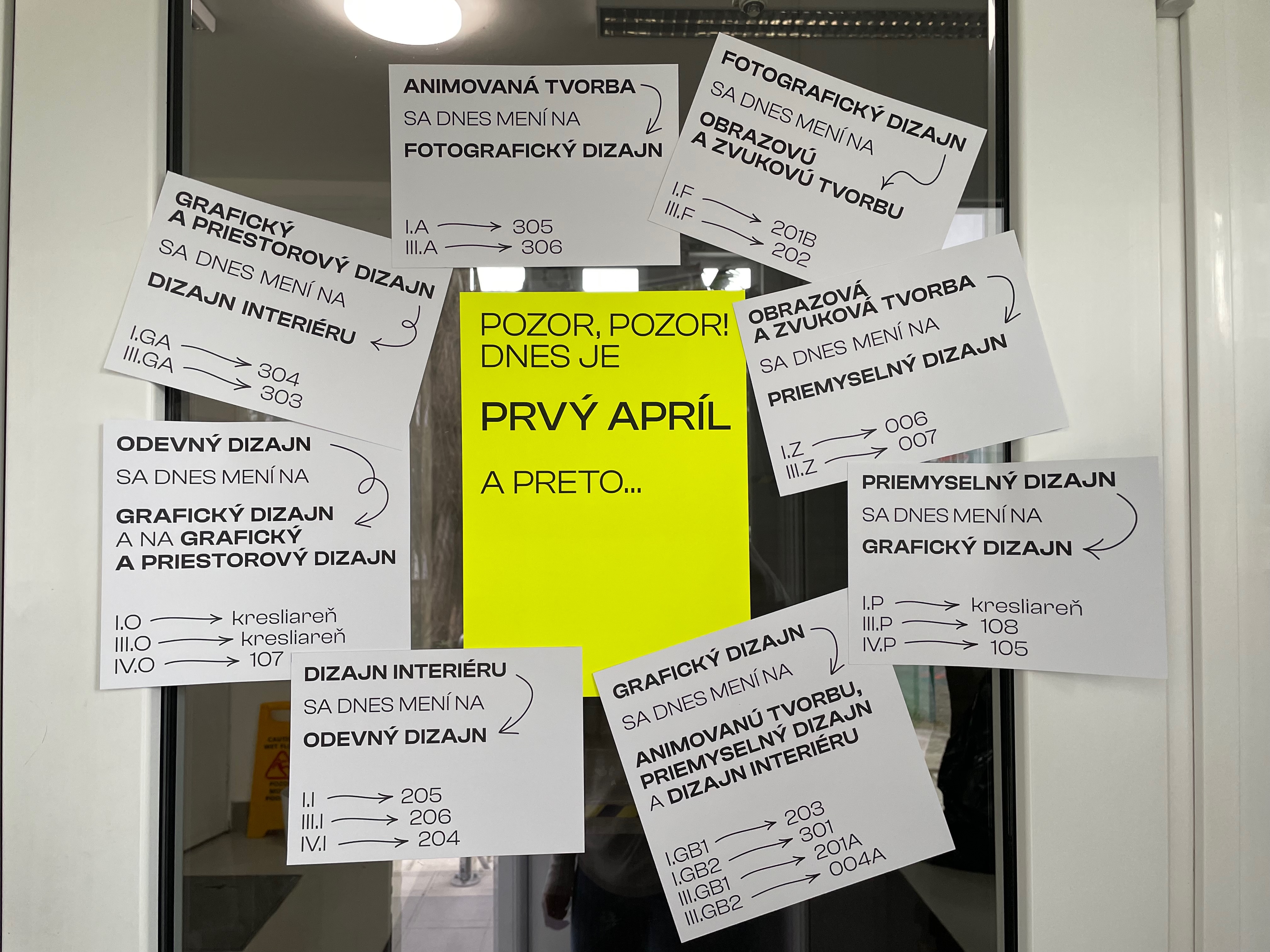 Na tohtoročný 1. apríl sme si pre študentky a študentov pripravili prekvapenie. Hneď ráno po príchode do školy zistili, že ich čaká netradičný deň – poprehadzovali sme im učebné odbory! Interiérové dizajnérky sa na jeden deň stali módnymi návrhárkami, odbor animovaná tvorba si vyskúšal fotografiu, grafickí dizajnéri a dizajnérky spoznali prácu odborov animovanej tvorby, priemyselného dizajnu alebo dizajnu interiéru…