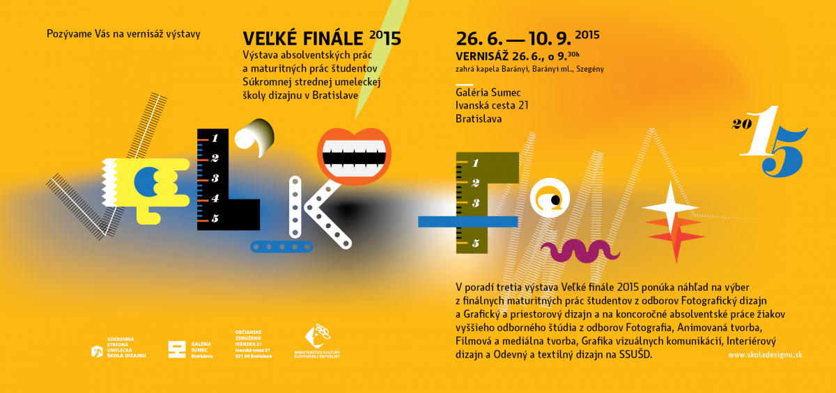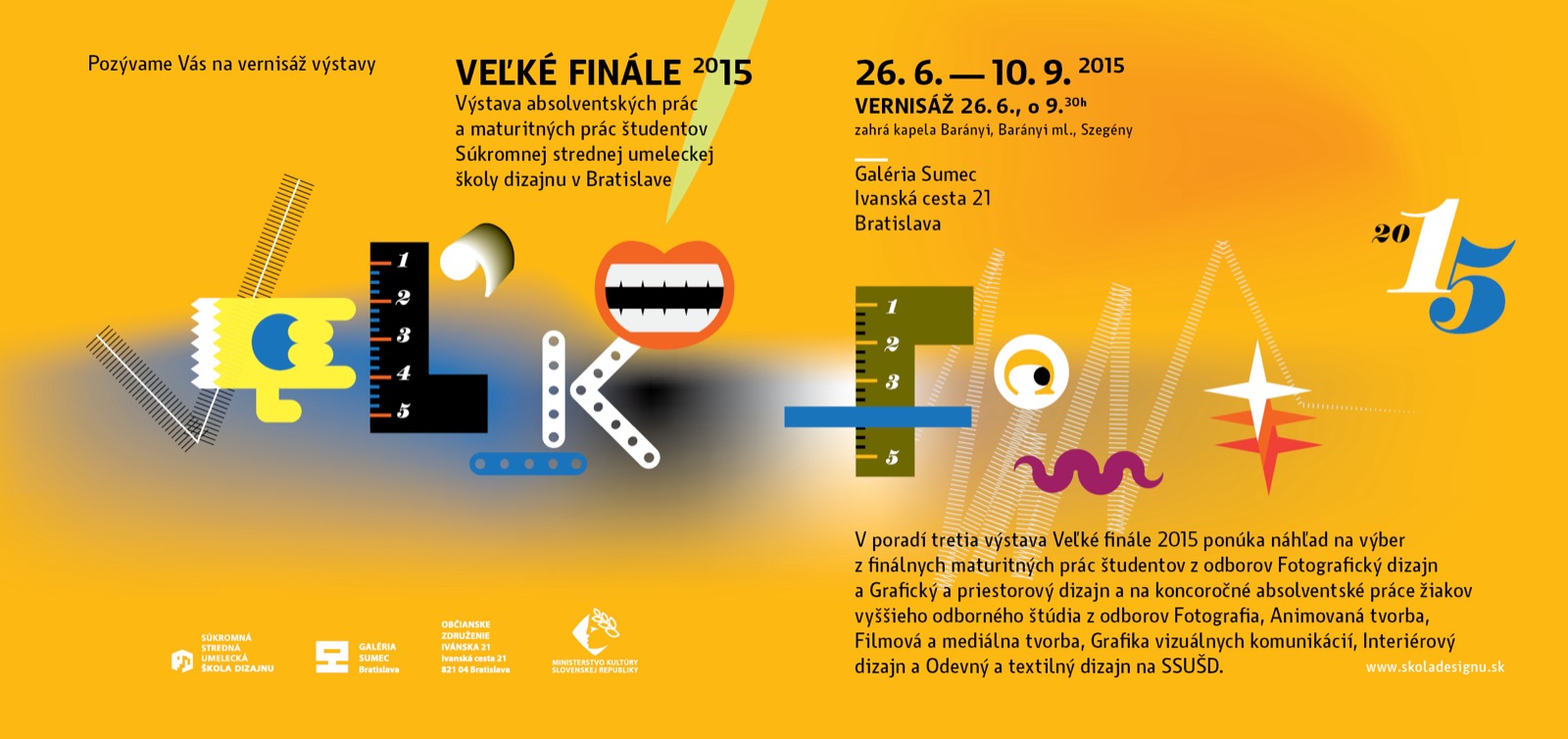 V poradí tretia výstava Veľké finále 2015 ponúka náhľad na výber z finálnych maturitných prác študentov z odborov Fotografický dizajn a Grafický a priestorový dizajn a na koncoročné absolventské práce žiakov vyššieho odborného štúdia z odborov Fotografia, Animovaná tvorba, Filmová a mediálna tvorba, Grafika vizuálnych komunikácií, Interiérový dizajn a Odevný a textilný dizajn na SSUŠD.